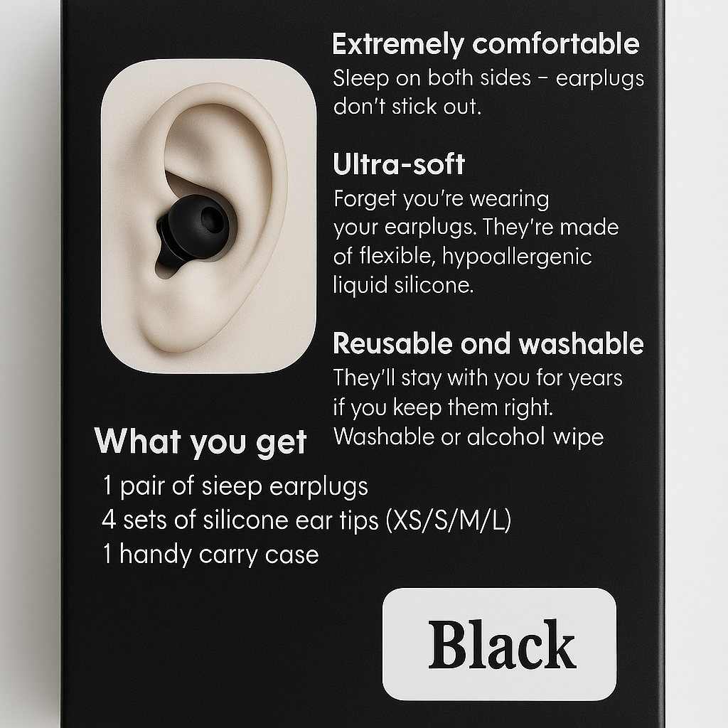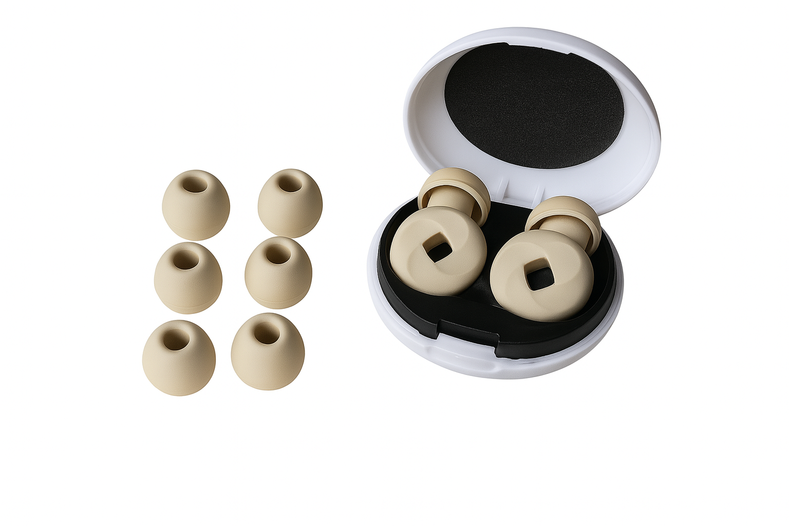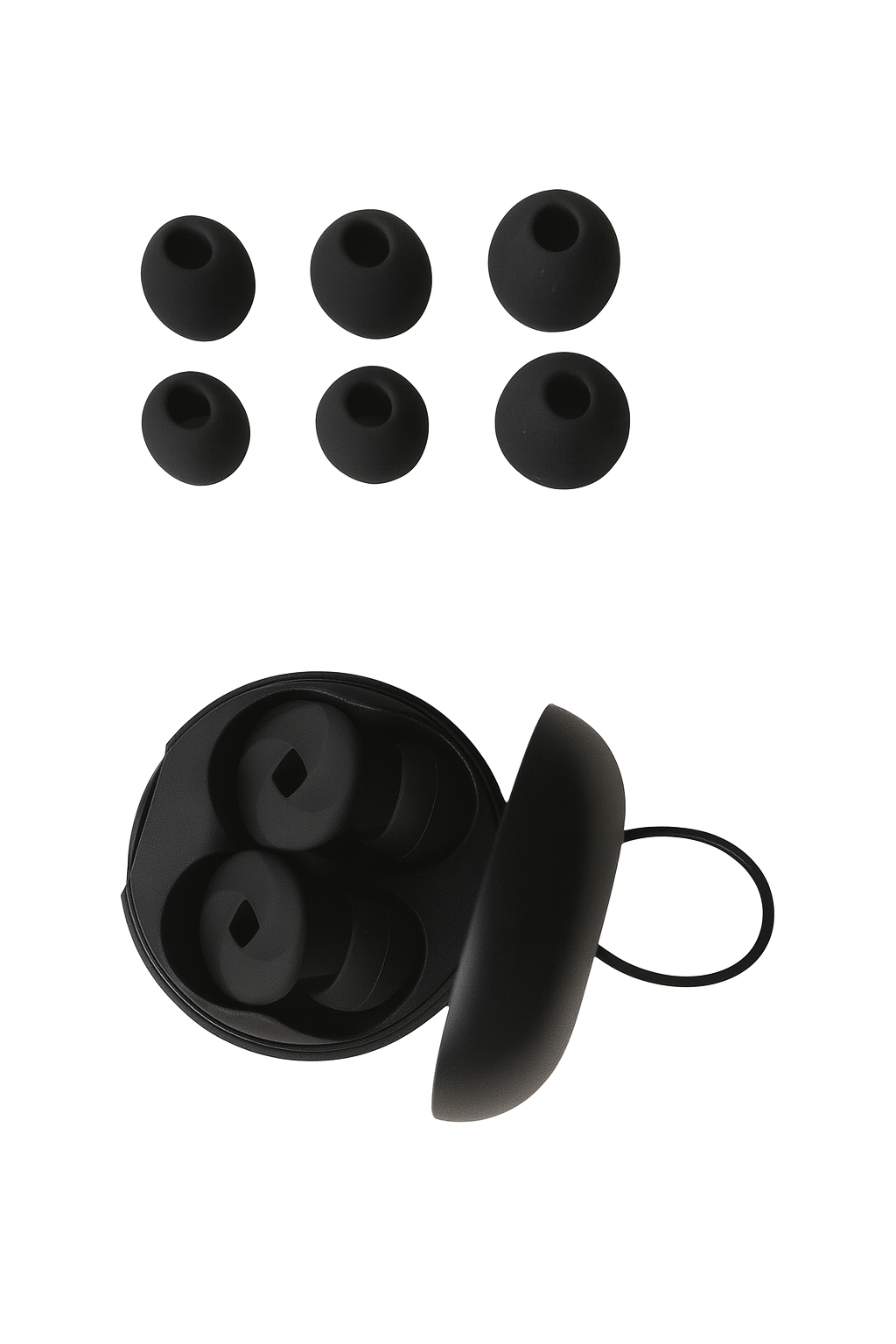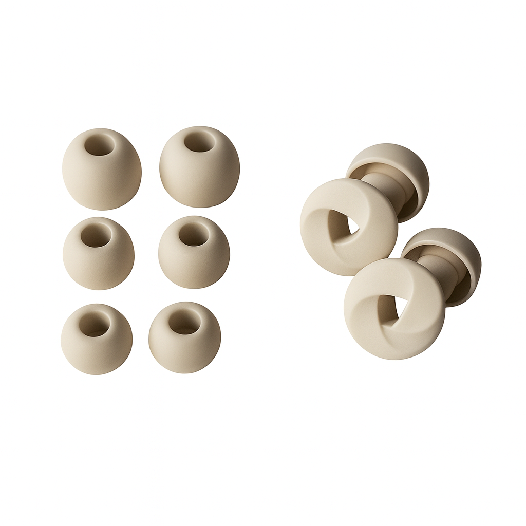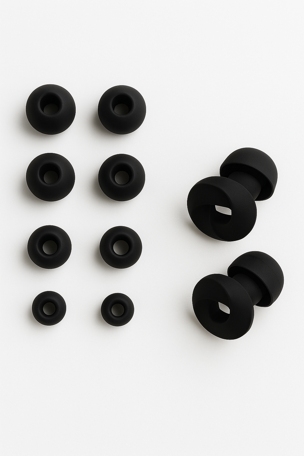Soft silicone ear buds that come in black or starlight (almost ivory).